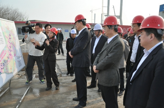 3月26日,南京市委副书记、市长缪瑞林在南京市建邺区区委书记冯亚军、南车蒲镇公司总经理李定南、局浙江分公司总经理欧阳兵、公司副总经理陈世川的陪同下,到南京河西新城快速公交一号线车辆基地项目检查调研。